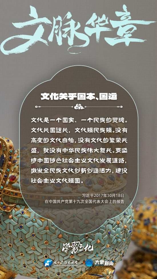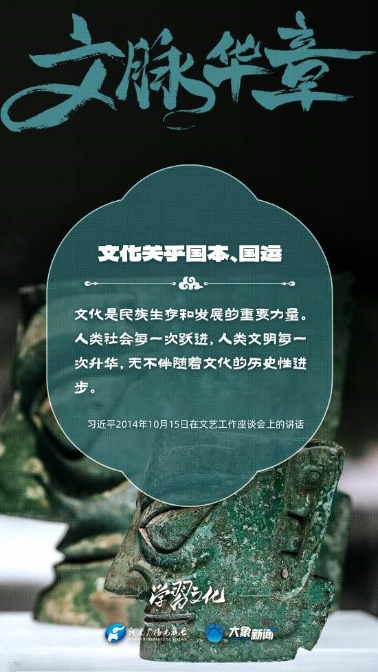 習(xí)近平總書(shū)記高度重視文化之于國(guó)家、之于民族的重大意義,強(qiáng)調(diào):文化是一個(gè)國(guó)家、一個(gè)民族的靈魂。文化興國(guó)運(yùn)興,文化強(qiáng)民族強(qiáng)。沒(méi)有高度的文化自信,沒(méi)有文化的繁榮興盛,就沒(méi)有中華民族偉大復(fù)興。大象新聞梳理了習(xí)近平總書(shū)記的系列重要論述,我們一起學(xué)習(xí)。