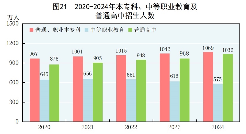 全年研究生教育招生135.7萬(wàn)人,在學(xué)研究生409.5萬(wàn)人,畢業(yè)生108.4萬(wàn)人。普通、職業(yè)本專科[74]招生1068.9萬(wàn)人,在校生3891.3萬(wàn)人,畢業(yè)生1059.4萬(wàn)人。中等職業(yè)教育[75]招生575.4萬(wàn)人,在校生1659.4萬(wàn)人,畢業(yè)生542.2萬(wàn)人。普通高中招生1036.2萬(wàn)人,在校生2922.3萬(wàn)人,畢業(yè)生891.0萬(wàn)人。初中招生1848.8萬(wàn)人,在校生5386.2萬(wàn)人,畢業(yè)生1698.2萬(wàn)人。普通小學(xué)招生1616.6萬(wàn)人,在校生10584.4萬(wàn)人,畢業(yè)生1857.3萬(wàn)人。特殊教育招生15.8萬(wàn)人,在校生91.6萬(wàn)人,畢業(yè)生17.7萬(wàn)人。學(xué)前教育在園幼兒3584.0萬(wàn)人。九年義務(wù)教育鞏固率為95.9%,高中階段毛入學(xué)率為92.0%。