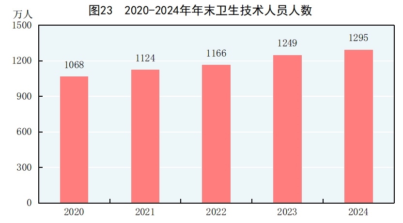 年末全國(guó)共有醫(yī)療衛(wèi)生機(jī)構(gòu)109.2萬(wàn)個(gè),其中醫(yī)院3.9萬(wàn)個(gè),在醫(yī)院中有公立醫(yī)院1.2萬(wàn)個(gè),民營(yíng)醫(yī)院2.7萬(wàn)個(gè);基層醫(yī)療衛(wèi)生機(jī)構(gòu)104.0萬(wàn)個(gè),其中鄉(xiāng)鎮(zhèn)衛(wèi)生院3.3萬(wàn)個(gè),社區(qū)衛(wèi)生服務(wù)中心(站)3.7萬(wàn)個(gè),門(mén)診部(所)39.8萬(wàn)個(gè),村衛(wèi)生室57.1萬(wàn)個(gè);專業(yè)公共衛(wèi)生機(jī)構(gòu)9217個(gè)(不含衛(wèi)生監(jiān)督所、中心),其中疾病預(yù)防控制中心3429個(gè)。衛(wèi)生技術(shù)人員1295萬(wàn)人,其中執(zhí)業(yè)醫(yī)師和執(zhí)業(yè)助理醫(yī)師505萬(wàn)人,注冊(cè)護(hù)士584萬(wàn)人。醫(yī)療衛(wèi)生機(jī)構(gòu)床位1037萬(wàn)張,其中醫(yī)院818萬(wàn)張,鄉(xiāng)鎮(zhèn)衛(wèi)生院151萬(wàn)張。全年總診療人次[79]101.1億人次,出院人次[80]3.1億人次。