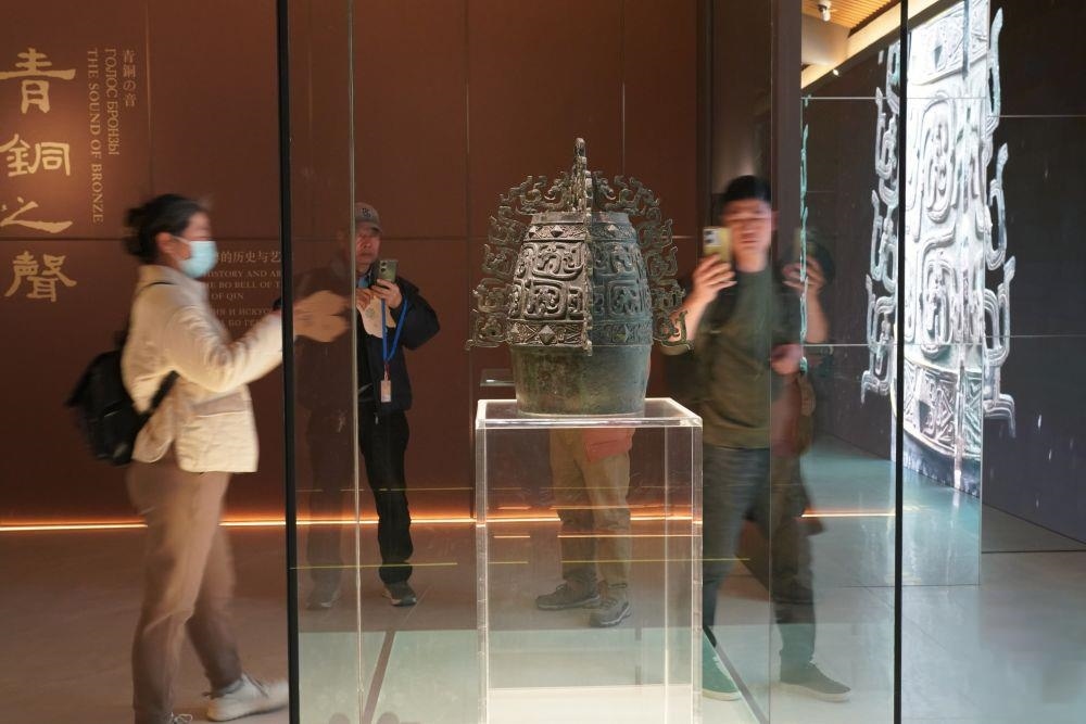 △2月26日,游客在西部機(jī)場博物館珍寶館內(nèi)參觀國家一級文物“秦公镈”。