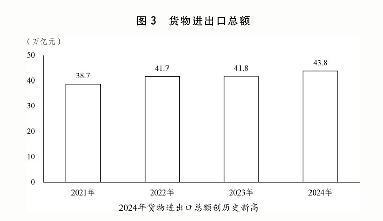 二是外貿(mào)出口對經(jīng)濟(jì)增長貢獻(xiàn)增大。出臺關(guān)于促進(jìn)外貿(mào)穩(wěn)定增長、拓展跨境電商出口推進(jìn)海外倉建設(shè)、推動(dòng)服務(wù)貿(mào)易和數(shù)字貿(mào)易發(fā)展的政策,貨物和服務(wù)凈出口對經(jīng)濟(jì)增長的貢獻(xiàn)率達(dá)30.3%。進(jìn)博會、廣交會、服貿(mào)會、投洽會、中俄博覽會等重大展會成功舉辦。出臺扎實(shí)推進(jìn)高水平對外開放更大力度吸引和利用外資行動(dòng)方案。發(fā)布外商投資準(zhǔn)入特別管理措施(負(fù)面清單)(2024年版),制造業(yè)領(lǐng)域外資準(zhǔn)入限制措施全面取消。推進(jìn)服務(wù)業(yè)擴(kuò)大開放綜合試點(diǎn)示范,開展增值電信、生物技術(shù)、獨(dú)資醫(yī)院開放試點(diǎn)。發(fā)布實(shí)施全國版和自貿(mào)試驗(yàn)區(qū)版跨境服務(wù)貿(mào)易負(fù)面清單。推出第八批標(biāo)志性重大外資項(xiàng)目。健全境外投資管理服務(wù)體系。