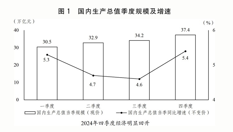 (一)因時(shí)因勢加強(qiáng)和創(chuàng)新宏觀調(diào)控,推動(dòng)經(jīng)濟(jì)回升向好。扎實(shí)開展宏觀政策逆周期調(diào)節(jié),加大政策力度,釋放政策效能,特別是9月26日中央政治局會議果斷部署一攬子增量政策,市場預(yù)期、社會信心有效提振,四季度經(jīng)濟(jì)明顯回升。全年國內(nèi)生產(chǎn)總值(GDP)134.9萬億元、增長5%,其中,一、二、三產(chǎn)業(yè)分別增長3.5%、5.3%、5%。