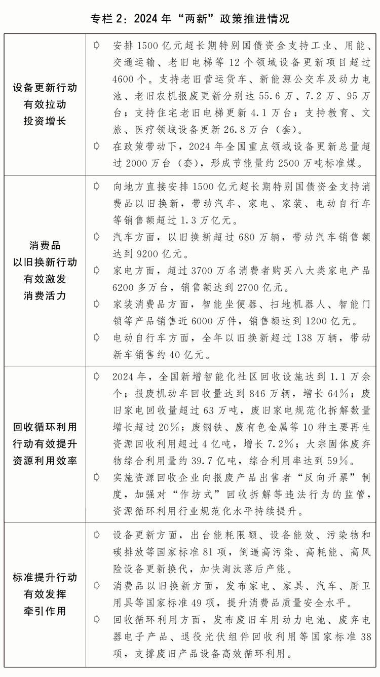 四是加力擴(kuò)圍實(shí)施“兩新”政策。安排超長期特別國債5000億元支持大規(guī)模設(shè)備更新和消費(fèi)品以舊換新,統(tǒng)籌投資、財(cái)政、金融等綜合性政策,深入推進(jìn)設(shè)備更新、消費(fèi)品以舊換新、回收循環(huán)利用、標(biāo)準(zhǔn)提升四大行動(dòng)。進(jìn)一步加大重點(diǎn)領(lǐng)域設(shè)備更新項(xiàng)目支持力度,加力實(shí)施設(shè)備更新貸款貼息,加快存量設(shè)備評估診斷和項(xiàng)目儲備。進(jìn)一步支持消費(fèi)品以舊換新,擴(kuò)大汽車報(bào)廢更新支持范圍,完善汽車置換更新補(bǔ)貼標(biāo)準(zhǔn),實(shí)施手機(jī)、平板等數(shù)碼產(chǎn)品購新補(bǔ)貼,積極支持家裝消費(fèi)品換新,簡化補(bǔ)貼申領(lǐng)和支付流程,完善資金監(jiān)管機(jī)制,嚴(yán)厲打擊價(jià)格欺詐和違規(guī)騙補(bǔ)套補(bǔ)行為。
