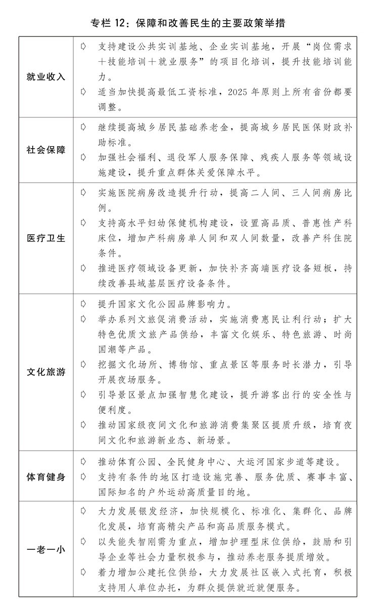一是實(shí)施提振消費(fèi)專項(xiàng)行動(dòng)。制定提升消費(fèi)能力、增加優(yōu)質(zhì)供給、改善消費(fèi)環(huán)境政策舉措,穩(wěn)定大宗消費(fèi)、擴(kuò)大服務(wù)消費(fèi)、拓展新型消費(fèi)、合理增加公共消費(fèi),推動(dòng)消費(fèi)提質(zhì)升級。多渠道促進(jìn)居民增收,推動(dòng)中低收入群體增收減負(fù),完善勞動(dòng)者工資正常增長機(jī)制。因城施策調(diào)減房地產(chǎn)消費(fèi)限制性措施,推動(dòng)建設(shè)安全、舒適、綠色、智慧的“好房子”,更好滿足人民群眾剛性和改善性住房需求、高品質(zhì)居住需要。進(jìn)一步優(yōu)化汽車限購管理政策,加快構(gòu)建充電基礎(chǔ)設(shè)施體系,開展汽車流通消費(fèi)改革試點(diǎn)。加快拓展文化、旅游、體育、健康、養(yǎng)老、托幼、家政、數(shù)字等服務(wù)消費(fèi),實(shí)施服務(wù)消費(fèi)提質(zhì)惠民活動(dòng)、“百城百區(qū)”文化和旅游消費(fèi)行動(dòng)計(jì)劃。加快培育帶動(dòng)性廣、顯示度高的消費(fèi)新場景,支持影視游戲創(chuàng)作與中華優(yōu)秀傳統(tǒng)文化、特色旅游資源相結(jié)合等融合式沉浸式消費(fèi)新場景發(fā)展。積極發(fā)展首發(fā)經(jīng)濟(jì)、冰雪經(jīng)濟(jì)、銀發(fā)經(jīng)濟(jì)。完善游艇、房車露營等新型消費(fèi)領(lǐng)域管理機(jī)制和行業(yè)標(biāo)準(zhǔn),促進(jìn)“人工智能+消費(fèi)”,優(yōu)化消費(fèi)新業(yè)態(tài)新領(lǐng)域市場準(zhǔn)入環(huán)境,加快推動(dòng)各類新技術(shù)應(yīng)用推廣并向消費(fèi)級產(chǎn)品轉(zhuǎn)化。清理對消費(fèi)的不合理限制。深入實(shí)施優(yōu)化消費(fèi)環(huán)境三年行動(dòng),加強(qiáng)消費(fèi)信用體系和質(zhì)量標(biāo)準(zhǔn)體系建設(shè),規(guī)范網(wǎng)絡(luò)銷售、直播帶貨領(lǐng)域不合理經(jīng)營行為,強(qiáng)化消費(fèi)者權(quán)益保護(hù)。落實(shí)和優(yōu)化帶薪年休假制度。完善外國人入境居留政策和免稅店政策,推動(dòng)擴(kuò)大入境消費(fèi)。深化國際消費(fèi)中心城市建設(shè)。