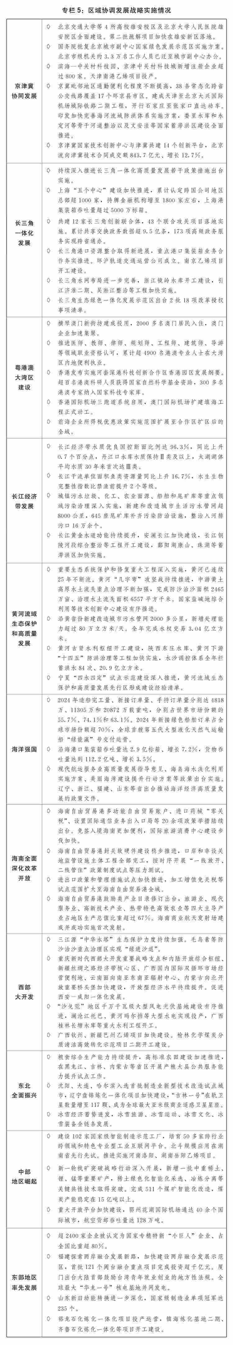 一是區(qū)域協(xié)調(diào)發(fā)展積厚成勢。京津冀協(xié)同發(fā)展走深走實(shí),在京相關(guān)高校、醫(yī)院、中央企業(yè)總部及二三級子公司分批向雄安新區(qū)疏解,北京城市副中心行政辦公、商務(wù)服務(wù)、文化旅游等功能不斷完善,進(jìn)一步支持天津?yàn)I海新區(qū)高質(zhì)量發(fā)展若干政策措施出臺實(shí)施,三省市互聯(lián)互通交通網(wǎng)絡(luò)更加完善、產(chǎn)業(yè)鏈上下游協(xié)作持續(xù)強(qiáng)化、公共服務(wù)共建共享水平進(jìn)一步提升。長三角一體化高質(zhì)量發(fā)展深入推進(jìn),生態(tài)綠色一體化發(fā)展示范區(qū)改革授權(quán)壓茬推進(jìn),港口資源整合、軌道互聯(lián)互通等取得新進(jìn)展,上?!拔鍌€(gè)中心”建設(shè)進(jìn)一步加快?;浉郯拇鬄硡^(qū)建設(shè)邁上新臺階,橫琴粵澳深度合作區(qū)封關(guān)“一線”“二線”分線管理運(yùn)行順利,超1.6萬名澳門居民在合作區(qū)居住生活,支持河套深港科技創(chuàng)新合作區(qū)深圳園區(qū)、香港園區(qū)聯(lián)動(dòng)發(fā)展,創(chuàng)新要素跨境流動(dòng)更加便捷。長江經(jīng)濟(jì)帶共抓大保護(hù)、不搞大開發(fā)成效顯著,進(jìn)一步抓實(shí)抓好長江大保護(hù)工作三年行動(dòng)計(jì)劃出臺實(shí)施,長江十年禁漁取得明顯成效,長江干流連續(xù)5年保持Ⅱ類水質(zhì),綜合立體交通走廊加快構(gòu)建,沿江高鐵全線開工建設(shè)。黃河流域生態(tài)保護(hù)和高質(zhì)量發(fā)展邁出堅(jiān)實(shí)步伐,農(nóng)業(yè)面源、城鎮(zhèn)生活、工業(yè)和尾礦庫污染治理深入推進(jìn),8萬余個(gè)入河排污口開展溯源整治,一批生態(tài)保護(hù)修復(fù)重點(diǎn)項(xiàng)目加快建設(shè),黃河干流連續(xù)3年保持Ⅱ類水質(zhì)。海洋強(qiáng)國建設(shè)深入推進(jìn),海洋強(qiáng)省、現(xiàn)代海洋城市、全國海洋經(jīng)濟(jì)發(fā)展示范區(qū)創(chuàng)新發(fā)展,海洋生態(tài)環(huán)境質(zhì)量持續(xù)改善,海洋生產(chǎn)總值超10萬億元。