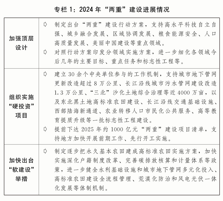 三是加力推進(jìn)“兩重”建設(shè)。進(jìn)一步完善自上而下的工作機(jī)制,加強(qiáng)“兩重”建設(shè)項(xiàng)目儲備,更好統(tǒng)籌“硬投資”與“軟建設(shè)”。安排超長期特別國債8000億元支持“兩重”建設(shè),進(jìn)一步優(yōu)化具體投向并提高項(xiàng)目支持比例,重點(diǎn)支持基礎(chǔ)研究能力提升、未來產(chǎn)業(yè)發(fā)展、東北等重點(diǎn)地區(qū)高標(biāo)準(zhǔn)農(nóng)田建設(shè)、大中型灌區(qū)新建改造及大中型引調(diào)水和大中型水庫建設(shè)、長江經(jīng)濟(jì)帶生態(tài)環(huán)境保護(hù)和綠色發(fā)展、農(nóng)業(yè)轉(zhuǎn)移人口市民化公共服務(wù)體系建設(shè)、高等教育提質(zhì)升級、城市地下管網(wǎng)管廊建設(shè)改造等方面任務(wù),強(qiáng)化超長期貸款等配套融資,高質(zhì)量推進(jìn)“硬投資”項(xiàng)目謀劃實(shí)施。加大力度推動(dòng)“軟建設(shè)”政策落地見效。