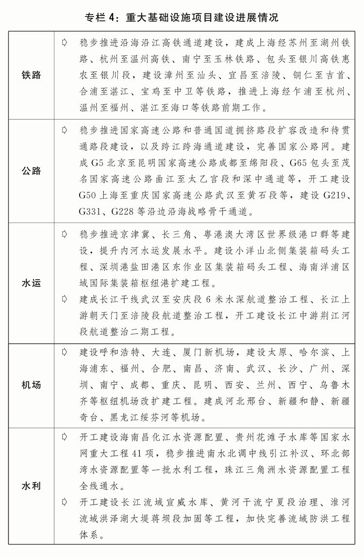 五是加快完善現(xiàn)代化基礎(chǔ)設(shè)施體系。高質(zhì)量推進(jìn)川藏鐵路等重大項(xiàng)目建設(shè),加快構(gòu)建國家水網(wǎng)工程體系,高水平共建西部陸海新通道。深入實(shí)施降低全社會物流成本專項(xiàng)行動(dòng)。持續(xù)推進(jìn)國家物流樞紐、國家骨干冷鏈物流基地、國家綜合貨運(yùn)樞紐體系、大宗商品資源配置樞紐等布局建設(shè)。加快完善應(yīng)急物流體系。深入推進(jìn)公路水路交通基礎(chǔ)設(shè)施數(shù)字化轉(zhuǎn)型升級。推動(dòng)各種運(yùn)輸方式規(guī)則標(biāo)準(zhǔn)統(tǒng)一協(xié)同,加快多式聯(lián)運(yùn)“一單制、一箱制”應(yīng)用。