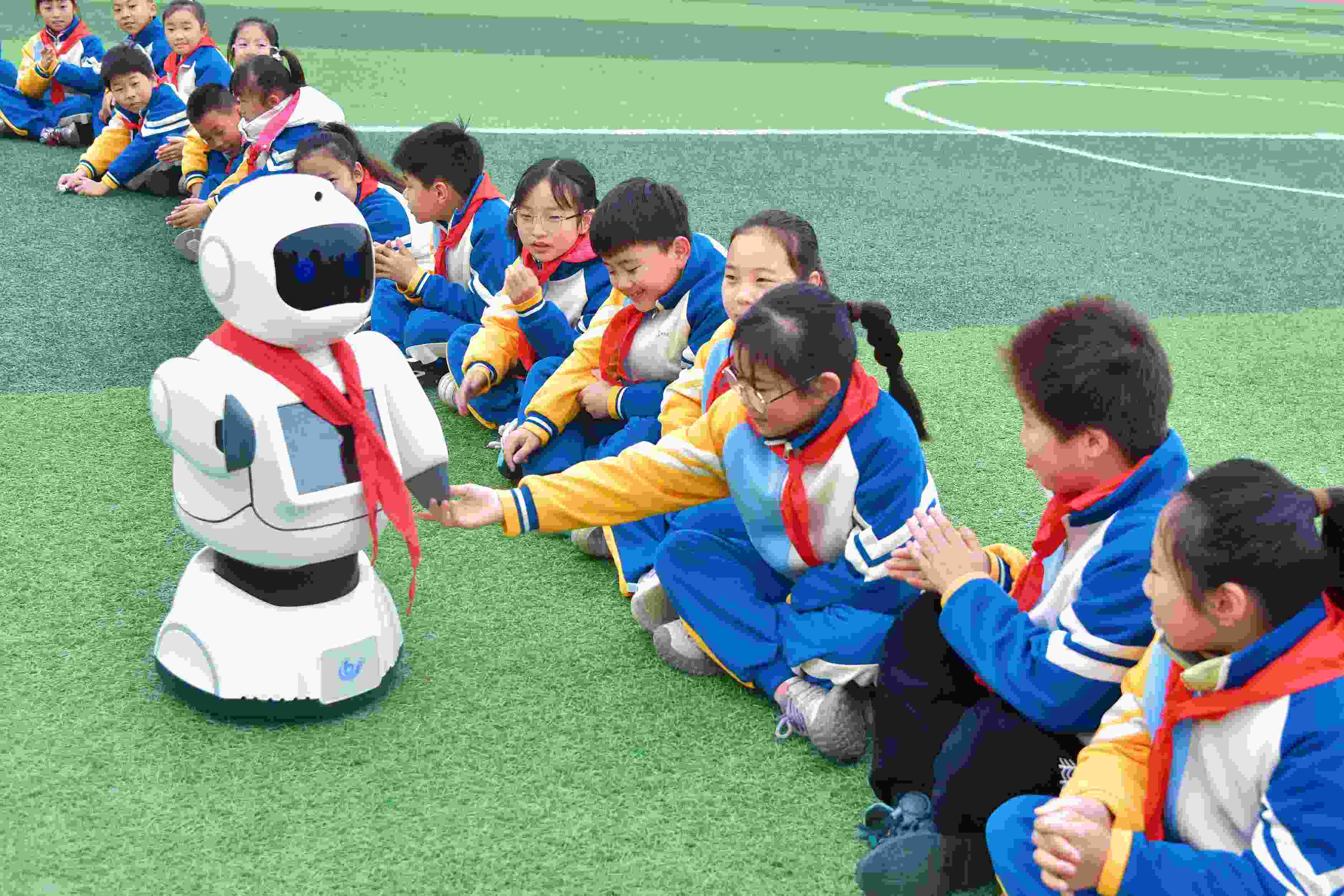 △2025年3月10日,江蘇南通,如皋經(jīng)濟技術(shù)開發(fā)區(qū)實驗小學(xué)課間,學(xué)生與智能機器人“賓果”互動。