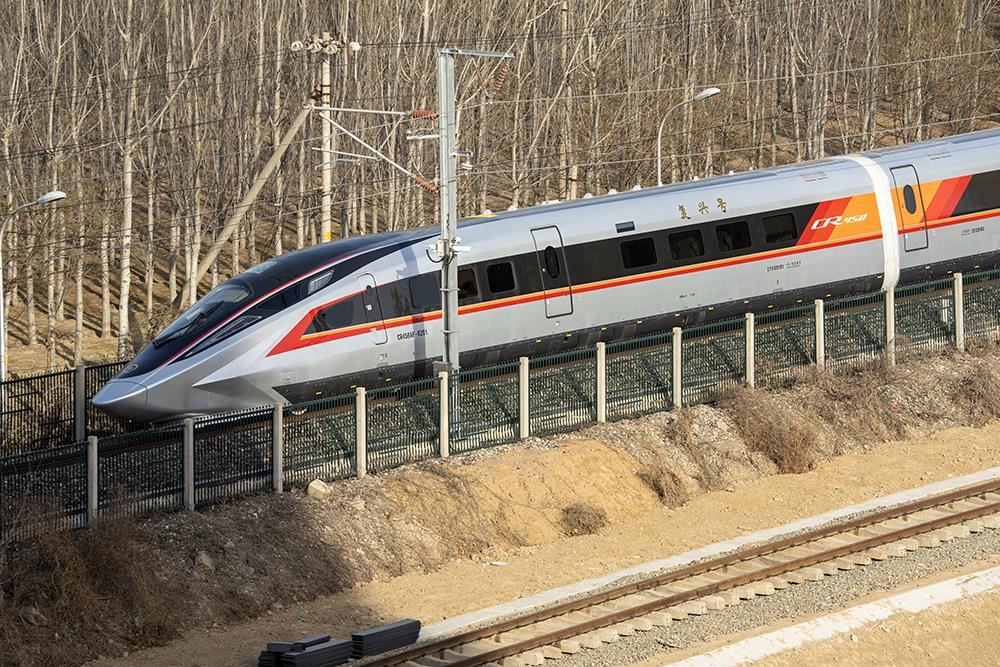 △2025年2月15日,中國鐵道科學(xué)院試驗中心環(huán)形試驗場,復(fù)興號CR450型電力動車組進(jìn)場展開測試。