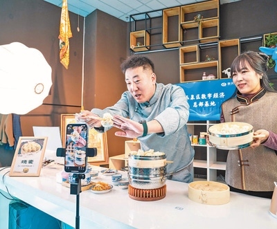 3月19日,內(nèi)蒙古呼和浩特市玉泉區(qū)數(shù)字經(jīng)濟總部基地直播間內(nèi),主播在推薦地方特色美食燒麥。
