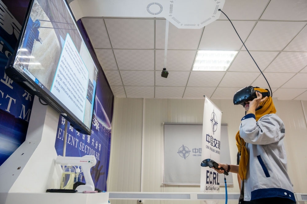 2021年11月9日,在位于彭亨州馬蘭的馬來西亞東海岸鐵路項(xiàng)目安全教育培訓(xùn)中心,一名工作人員借助VR技術(shù)學(xué)習(xí)安全知識(shí)。為確保項(xiàng)目安全推進(jìn),中國(guó)交通建設(shè)集團(tuán)有限公司在承建的馬東鐵項(xiàng)目沿線設(shè)立了多個(gè)虛擬現(xiàn)實(shí)和實(shí)體體驗(yàn)安全教育培訓(xùn)中心,借助沉浸式3D技術(shù)與VR設(shè)備,模擬了近百種潛在的施工現(xiàn)場(chǎng)危險(xiǎn)情況,有效提升了項(xiàng)目員工的安全意識(shí)和技能水平。