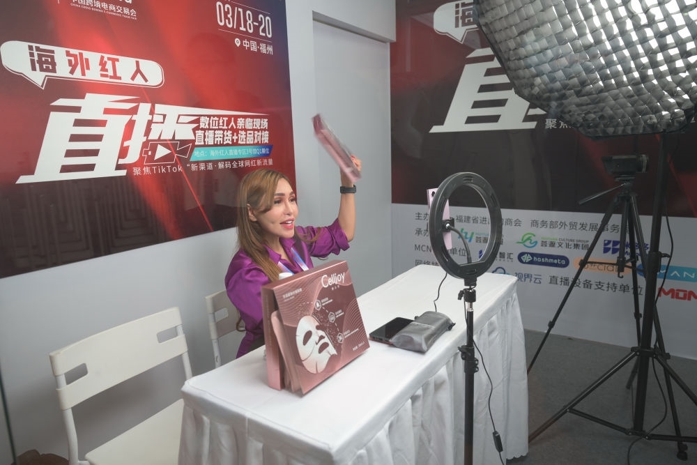 2024年3月18日,一名馬來西亞主播在福建福州舉行的第四屆中國(guó)跨境電商交易會(huì)展會(huì)現(xiàn)場(chǎng)直播帶貨。