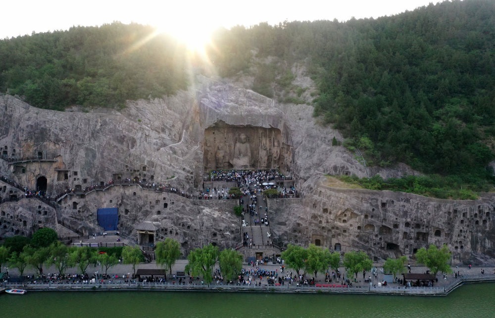 2025年4月24日,游客在龍門石窟游玩(無(wú)人機(jī)照片)。