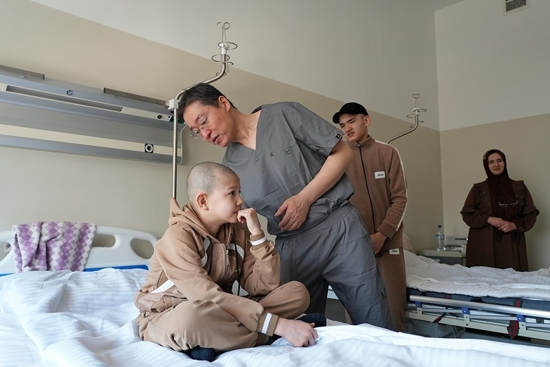 2025年2月20日,在位于烏茲別克斯坦塔什干的共和國耳鼻喉科及頭頸疾病專業(yè)科學(xué)實(shí)踐醫(yī)療中心,劉玉和醫(yī)生(左二) 在術(shù)前查看患兒情況。新華社發(fā)(扎法爾?攝)
