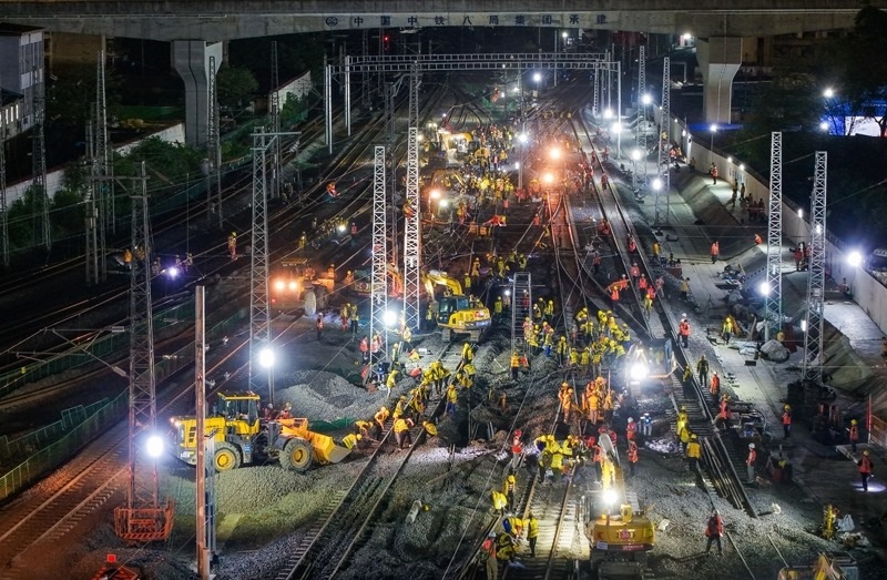 6月19日,在成渝中線高鐵成都站南北站場交替施工現(xiàn)場,中鐵八局施工人員在拆除原來的軌道和枕木,上方中國中鐵電氣化局的施工人員在進行接觸網(wǎng)施工作業(yè)。