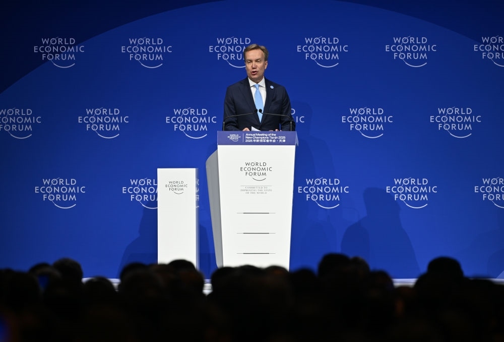 6月25日,世界經(jīng)濟論壇總裁博爾格·布倫德在2025夏季達沃斯論壇開幕式上發(fā)言。新華社記者 孫凡越 攝