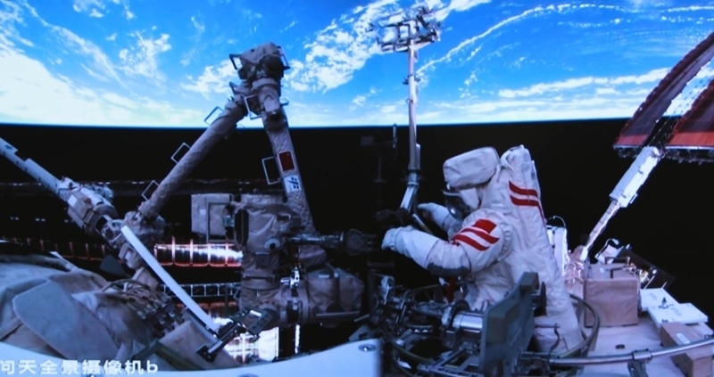 這是6月26日在北京航天飛行控制中心屏幕上拍攝的神舟二十號(hào)航天員陳中瑞在空間站組合體艙外工作的畫面。新華社發(fā)(周柯毅 攝)