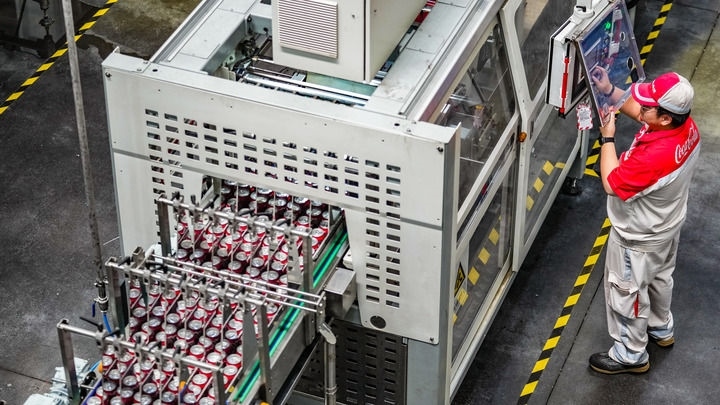 中糧可口可樂(lè)飲料(貴州)有限公司的工作人員在生產(chǎn)線旁進(jìn)行操作(2025年8月24日攝)。新華社記者 陶亮 攝