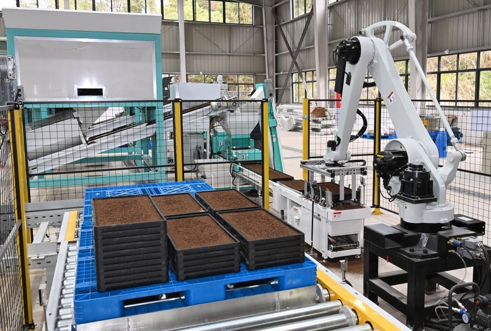 在浙江省東陽市皇野生態(tài)農(nóng)業(yè)有限公司現(xiàn)代農(nóng)事服務(wù)中心,全自動智能水稻育秧生產(chǎn)線在制作秧盤(2025年3月13日攝)。新華社發(fā)(包康軒 攝)