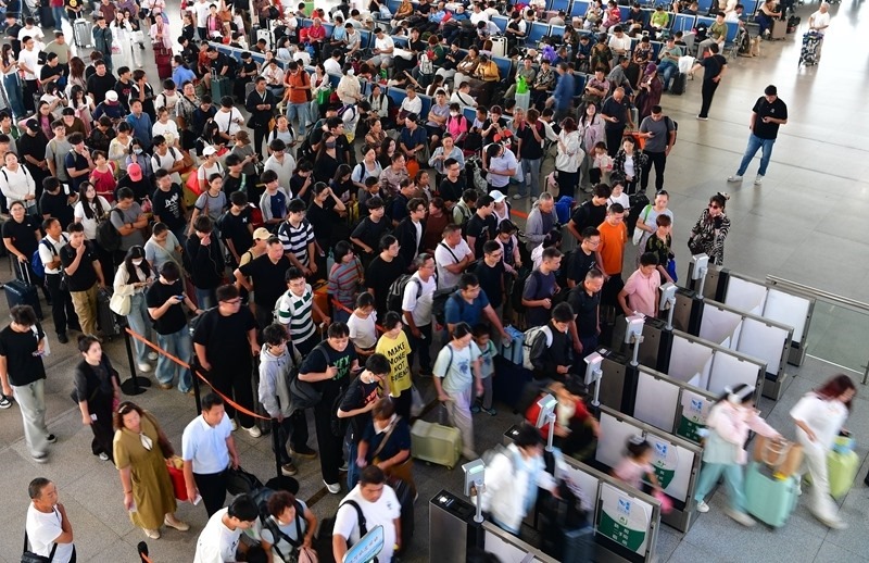 9月29日,旅客在江蘇無(wú)錫站候車(chē)大廳排隊(duì)檢票。