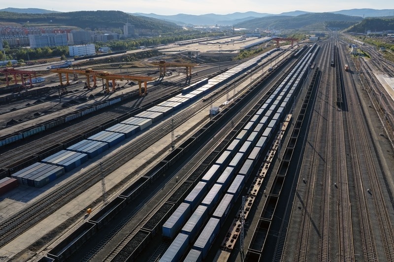 9月27日,滿(mǎn)載貨物的列車(chē)在綏芬河站北場(chǎng)進(jìn)行換裝作業(yè)(無(wú)人機(jī)照片)。