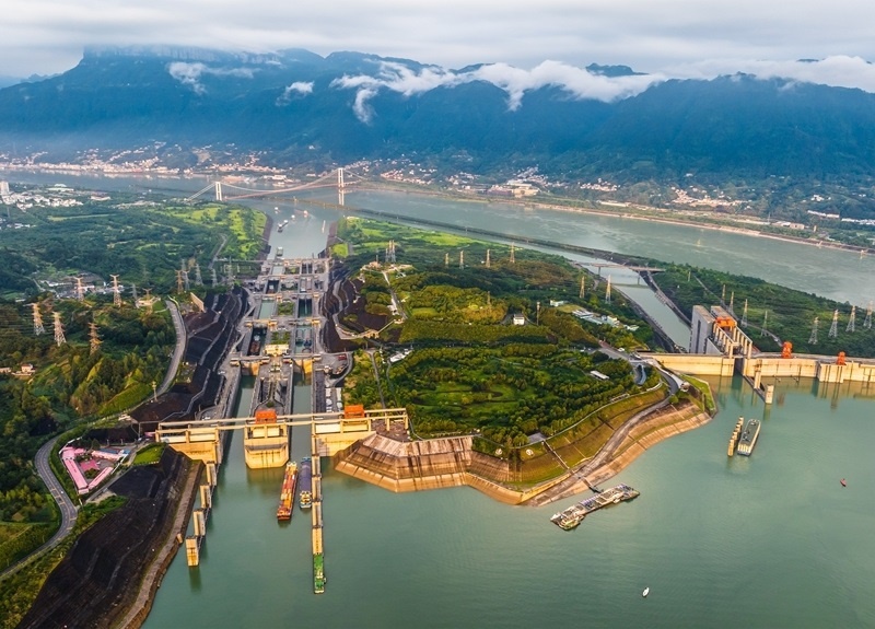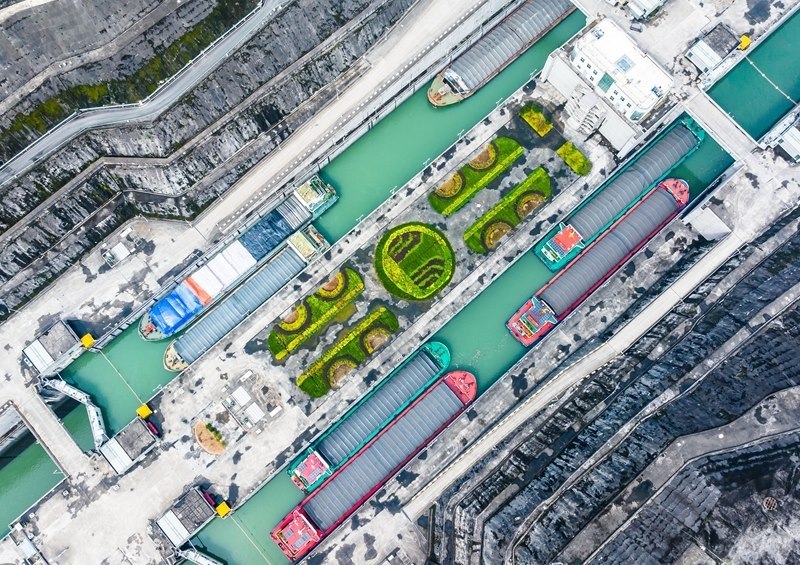 7月1日,在湖北宜昌,船舶有序通過三峽雙線五級(jí)船閘和升船機(jī)(無人機(jī)照片)。