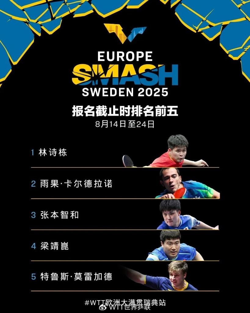 新華社北京7月6日電 世界乒乓球職業(yè)大聯(lián)盟(WTT)歐洲大滿貫賽瑞典站將于8月14日至24日在馬爾默舉行。首批參賽名單6日公布,男、女單打世界排名第一的國乒隊(duì)員林詩棟、孫穎莎在列。