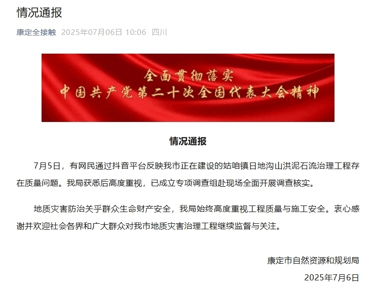中新網7月6日電 據(jù)“康定全接觸”微信公眾號消息,7月5日,有網民通過抖音平臺反映四川省康定市正在建設的姑咱鎮(zhèn)日地溝山洪泥石流治理工程存在質量問題??刀ㄊ凶匀毁Y源和規(guī)劃局獲悉后高度重視,已成立專項調查組赴現(xiàn)場全面開展調查核實。