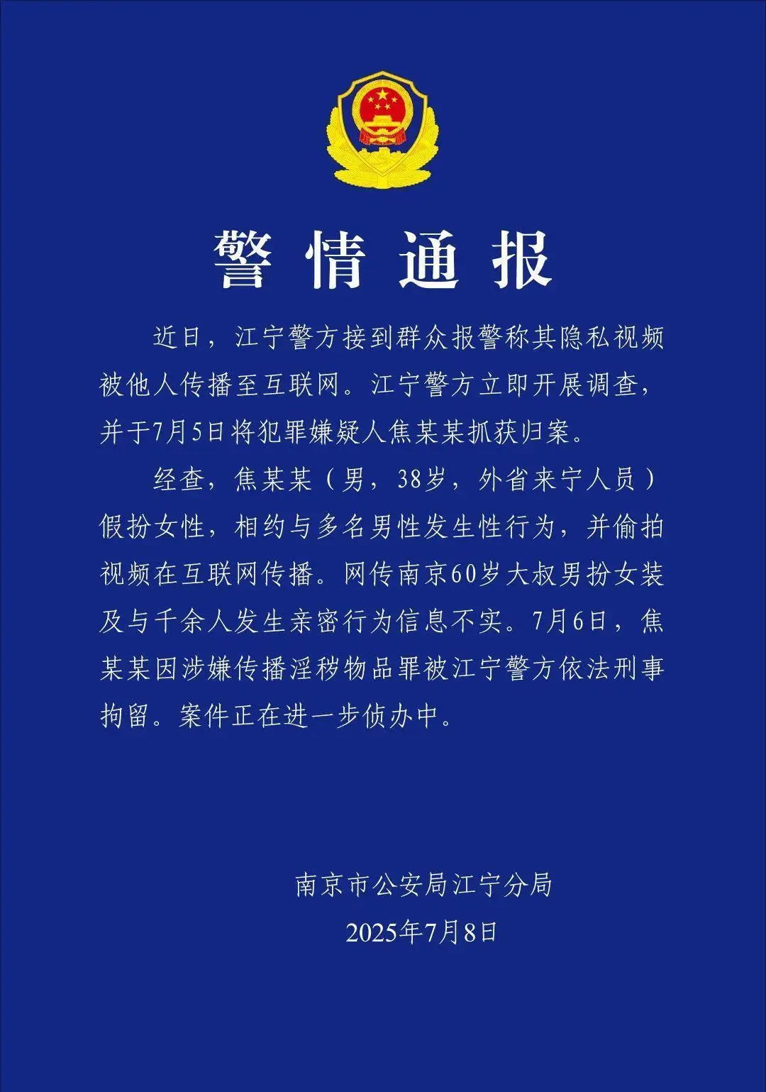 7月8日,南京江寧警方發(fā)布通報(bào)稱,焦某某(男,38歲,外省來寧人員)假扮女性,相約與多名男性發(fā)生性行為,并偷拍視頻在互聯(lián)網(wǎng)傳播。網(wǎng)傳南京60歲大叔男扮女裝及與千余人發(fā)生親密行為信息不實(shí)。目前,焦某某因涉嫌傳播淫穢物品罪被江寧警方依法刑事拘留。案件正在進(jìn)一步偵辦中。