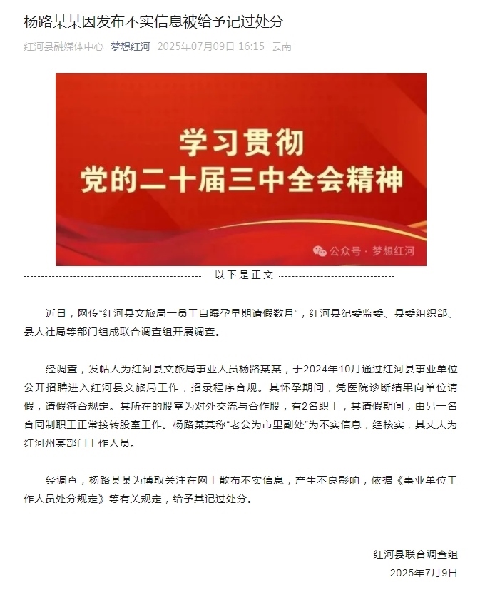 經(jīng)調(diào)查,發(fā)帖人為紅河縣文旅局事業(yè)人員楊路某某,于2024年10月通過紅河縣事業(yè)單位公開招聘進(jìn)入紅河縣文旅局工作,招錄程序合規(guī)。其懷孕期間,憑醫(yī)院診斷結(jié)果向單位請假,請假符合規(guī)定。其所在的股室為對外交流與合作股,有2名職工,其請假期間,由另一名合同制職工正常接轉(zhuǎn)股室工作。楊路某某稱“老公為市里副處”為不實(shí)信息,經(jīng)核實(shí),其丈夫?yàn)榧t河州某部門工作人員。