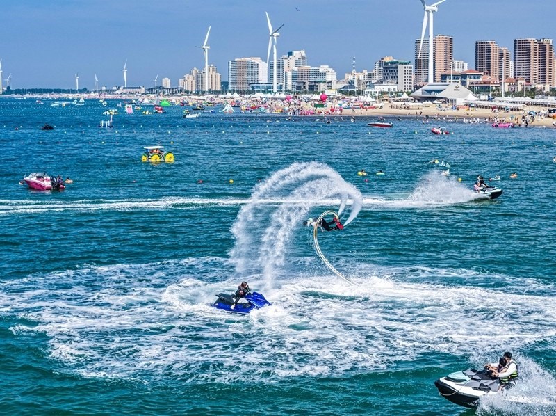 7月12日,在山東省榮成市那香海景區(qū),游客享受海上旅游項(xiàng)目帶來(lái)的清涼與歡樂(無(wú)人機(jī)照片)。
