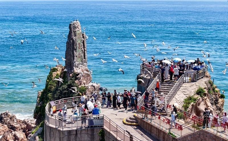 7月12日,山東省榮成市成山頭風(fēng)景區(qū),游客與黑尾鷗互動(dòng)(無(wú)人機(jī)照片)。