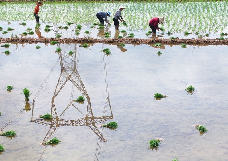 7月13日,湖南省衡陽市衡東縣霞流鎮(zhèn)農(nóng)民在搶插晚稻(無人機照片)。