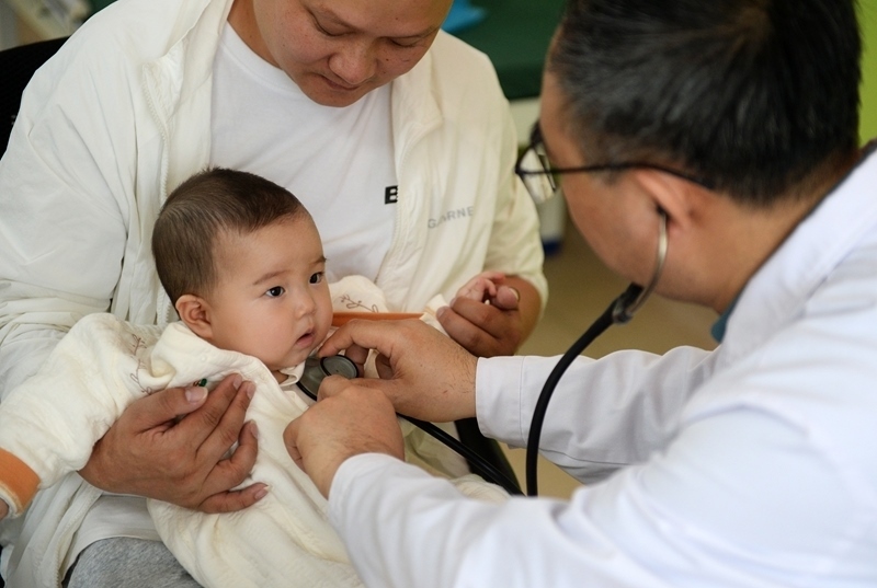在貴陽(yáng)市觀山湖區(qū)婦幼保健院,參加“天使之旅——先心病患兒篩查救助行動(dòng)”的山東第一醫(yī)科大學(xué)附屬中心醫(yī)院醫(yī)療專家在為孩子做檢查(2025年4月22日攝)。新華社記者 劉勇貞 攝
