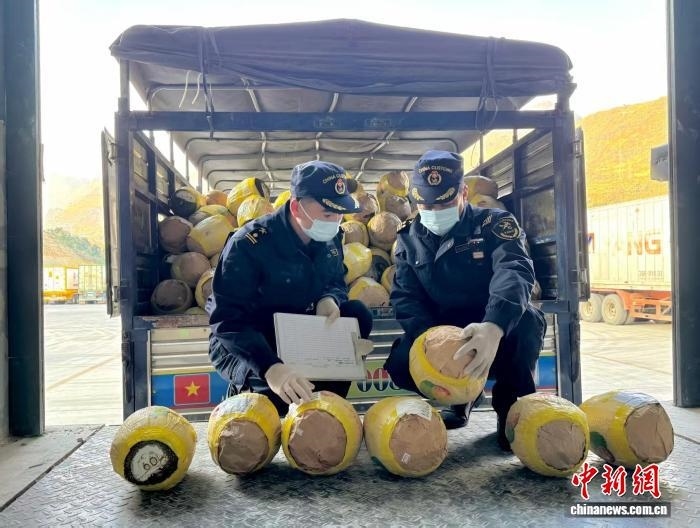 當前正值東南亞水果上市季節(jié)。上午8點,在天??诎秶H貨場,中越兩國貨車在橫跨盤龍河的大橋上交錯而過。一輛輛滿載越南新鮮荔枝、榴蓮的貨車有序駛入天保口岸,辦結通關手續(xù)后,這些水果將啟程運往中國內地。