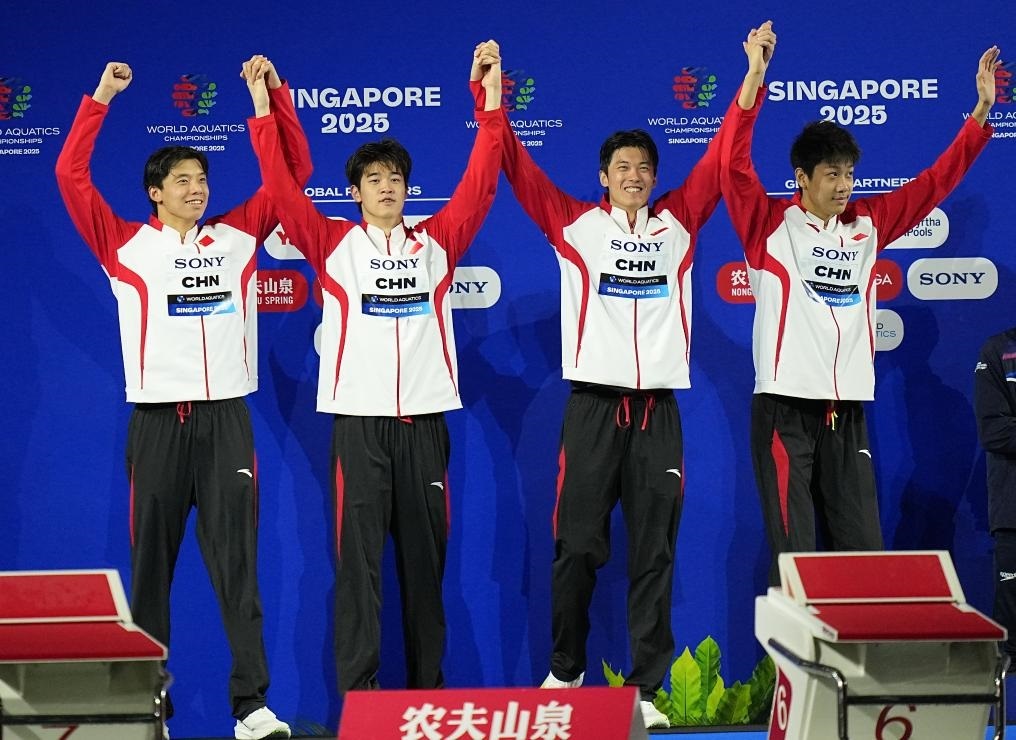 8月1日,由季新杰、潘展樂、汪順、張展碩(從左至右)組成的中國隊在頒獎儀式上。新華社記者 夏一方 攝