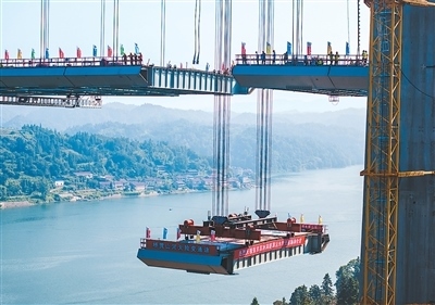8月3日,由湖南路橋建設集團承建的張官高速控制性工程洞庭溪沅水特大橋主橋順利合龍,為2026年全線通車奠定堅實基礎。張官高速公路北起張家界市永定區(qū),南至懷化市沅陵縣官莊鎮(zhèn),是國家高速公路網呼和浩特—北海高速公路的重要組成部分。圖為大橋施工現場,一塊鋼混結合梁在被緩緩提升。新華社記者 陳思汗攝