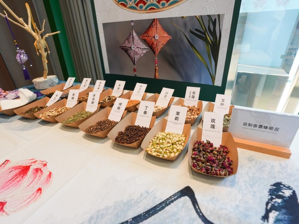 這是8月3日在成都世運(yùn)會(huì)運(yùn)動(dòng)員村A區(qū)中醫(yī)藥體驗(yàn)館拍攝的自制香囊體驗(yàn)區(qū)。新華社記者 王曦 攝