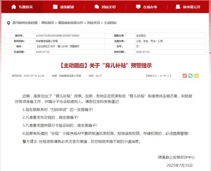 安徽績溪縣公安局7月31日發(fā)布關(guān)于育兒補貼的預(yù)警提示。