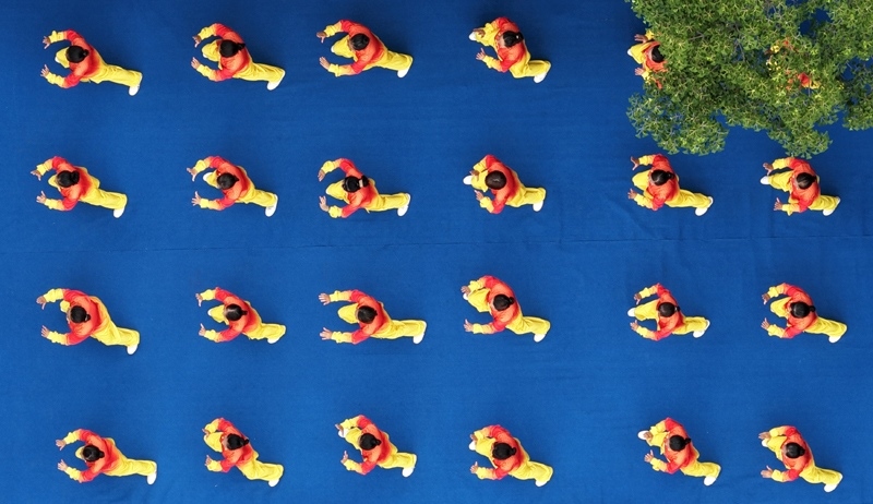 8月8日,在江蘇省揚州市宋夾城體育休閑公園,健身愛好者練習(xí)太極拳(無人機(jī)照片)。
