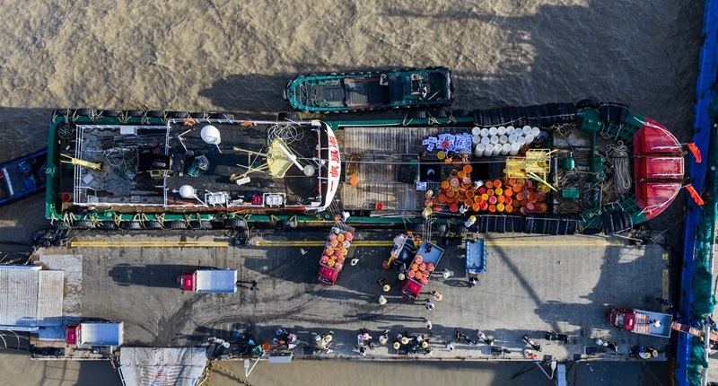 8月12日,開漁歸來的漁運船靠泊在舟山沈家門舟山國際水產(chǎn)城碼頭,整筐的梭子蟹被運送上岸裝車(無人機照片)。