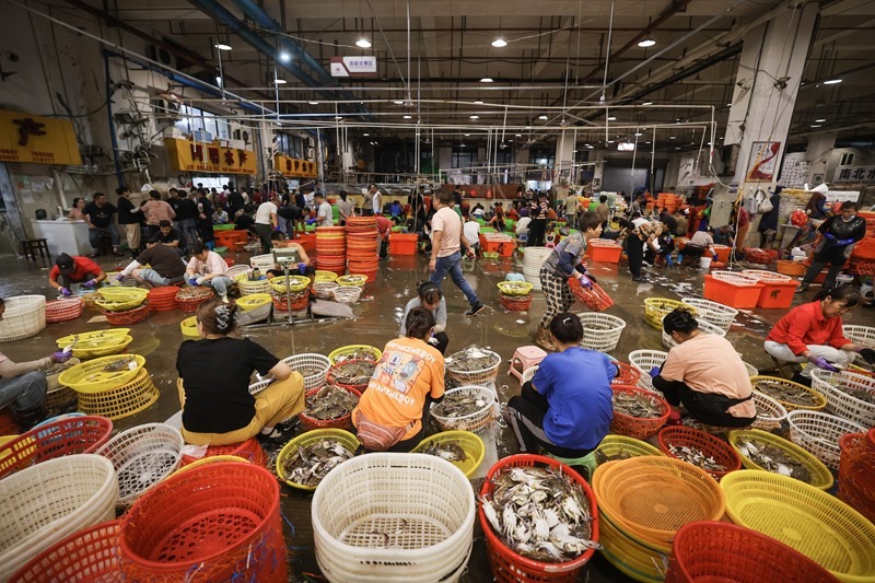 舟山沈家門漁港舟山國際水產(chǎn)城的商戶們迎來了忙碌的時節(jié),近期每天約有2000噸梭子蟹到港,經(jīng)過分揀、綁扎后發(fā)往各地市場。
