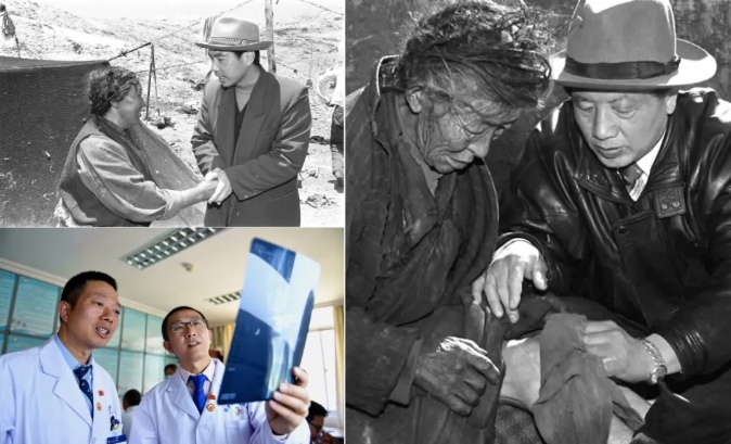 左上圖為來(lái)自陜西的援藏干部、阿里日土縣副縣長(zhǎng)賈冗勇深入牧區(qū),幫助藏族牧民解決生產(chǎn)、生活的實(shí)際困難(新華社記者土登攝,1997年11月11日發(fā));左下圖為2017年8月3日,北京積水潭醫(yī)院援藏醫(yī)生龔曉峰(右)和北京天壇醫(yī)院援藏醫(yī)生李家謀在拉薩市人民醫(yī)院骨科病房?jī)?nèi)查看患者的X光片(新華社記者晉美多吉攝);右圖為孔繁森(右)在阿里日土縣過(guò)巴鄉(xiāng)為孤寡老人益西卓瑪治?。ㄐ氯A社記者土登攝,1994年12月26日發(fā))。