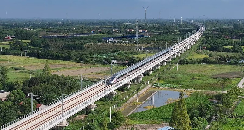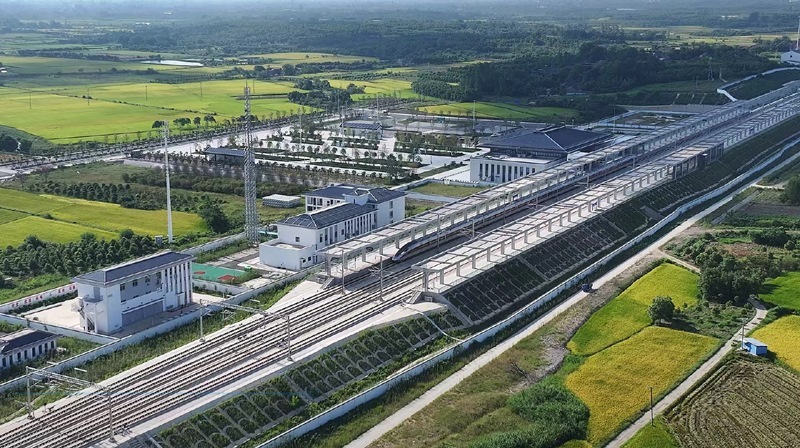 8月23日,試驗(yàn)列車從荊門市沙洋西站折返,駛向襄陽東站(無人機(jī)照片)。