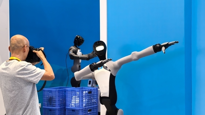 8月30日,一臺展示雙臂自由度的機器人在2025年上海合作組織峰會新聞中心吸引攝影師拍照。