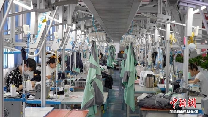 走進當?shù)匾患抑鳡I校服的服裝企業(yè),數(shù)字化吊掛系統(tǒng)賦能下,工廠流水線加速運轉(zhuǎn),企業(yè)校服日產(chǎn)量可達2萬套。