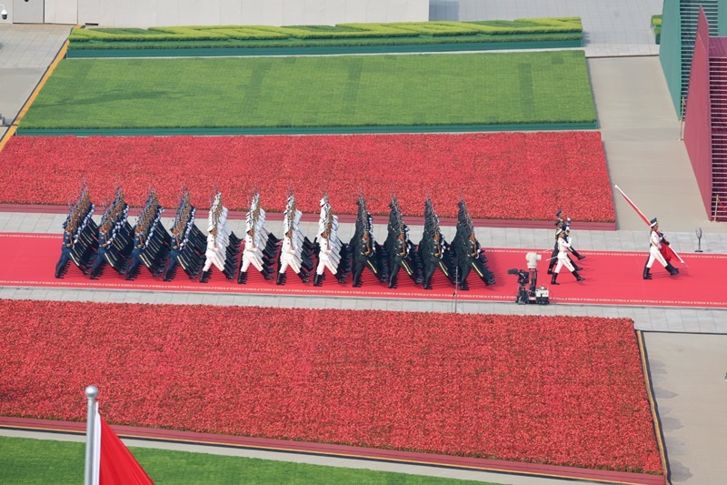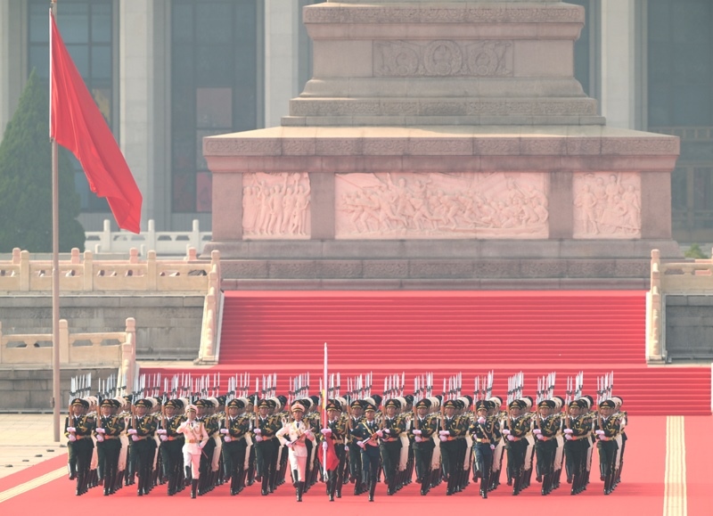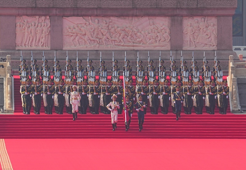 9月3日,紀(jì)念中國(guó)人民抗日戰(zhàn)爭(zhēng)暨世界反法西斯戰(zhàn)爭(zhēng)勝利80周年大會(huì)在北京天安門(mén)廣場(chǎng)隆重舉行。這是國(guó)旗護(hù)衛(wèi)隊(duì)從人民英雄紀(jì)念碑基座出發(fā),走向旗桿基座。