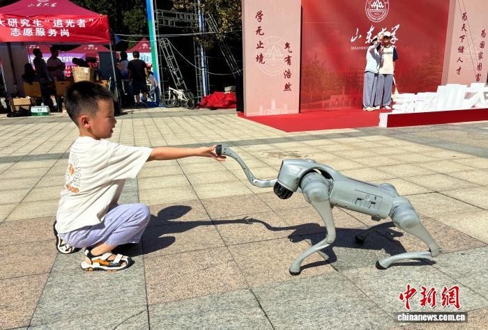 9月2日,山東濟(jì)南,一名小朋友在山東大學(xué)迎新現(xiàn)場和四足機(jī)器人握手。高藝芯 攝