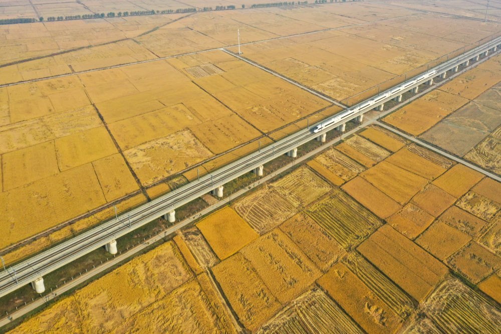 10月14日,在吉林省公主嶺市,一列高鐵列車沿著田間的鐵路線穿行(無(wú)人機(jī)照片)。2025年,吉林省深化農(nóng)機(jī)研發(fā)、制造、推廣、應(yīng)用一體化試點(diǎn)示范,農(nóng)作物耕種收綜合機(jī)械化率達(dá)94.6%。新華社記者 張楠 攝