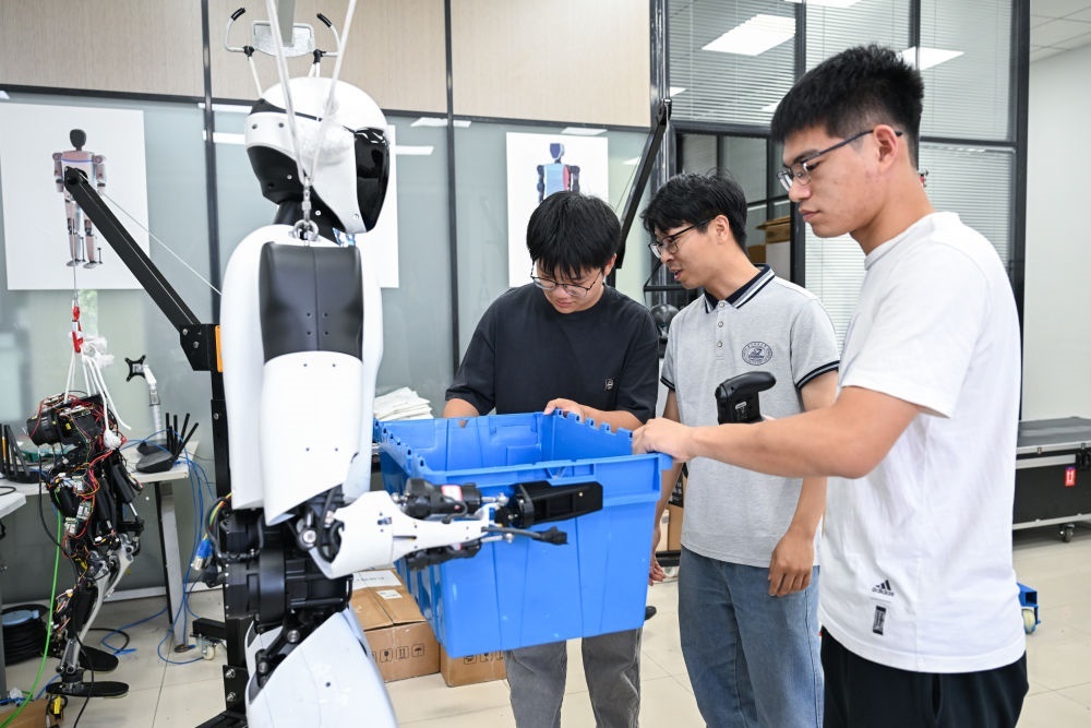 2025年5月29日,華中科技大學機械科學與工程學院,學生對“荊楚”人形機器人進行搬運測試。新華社記者 杜子璇 攝